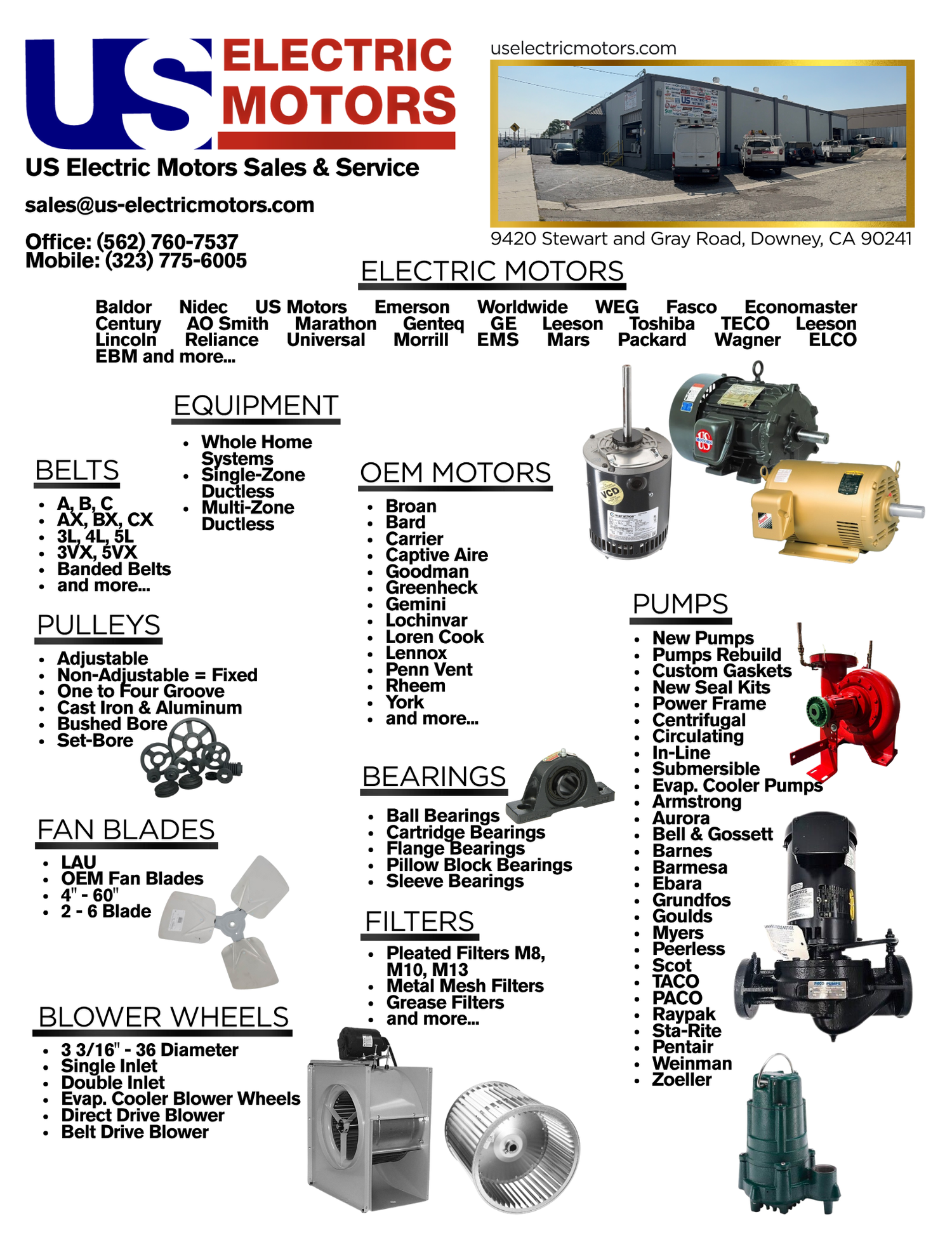 Complete service for blowers: motor replacement, wheels, bearings, brackets & shafts.